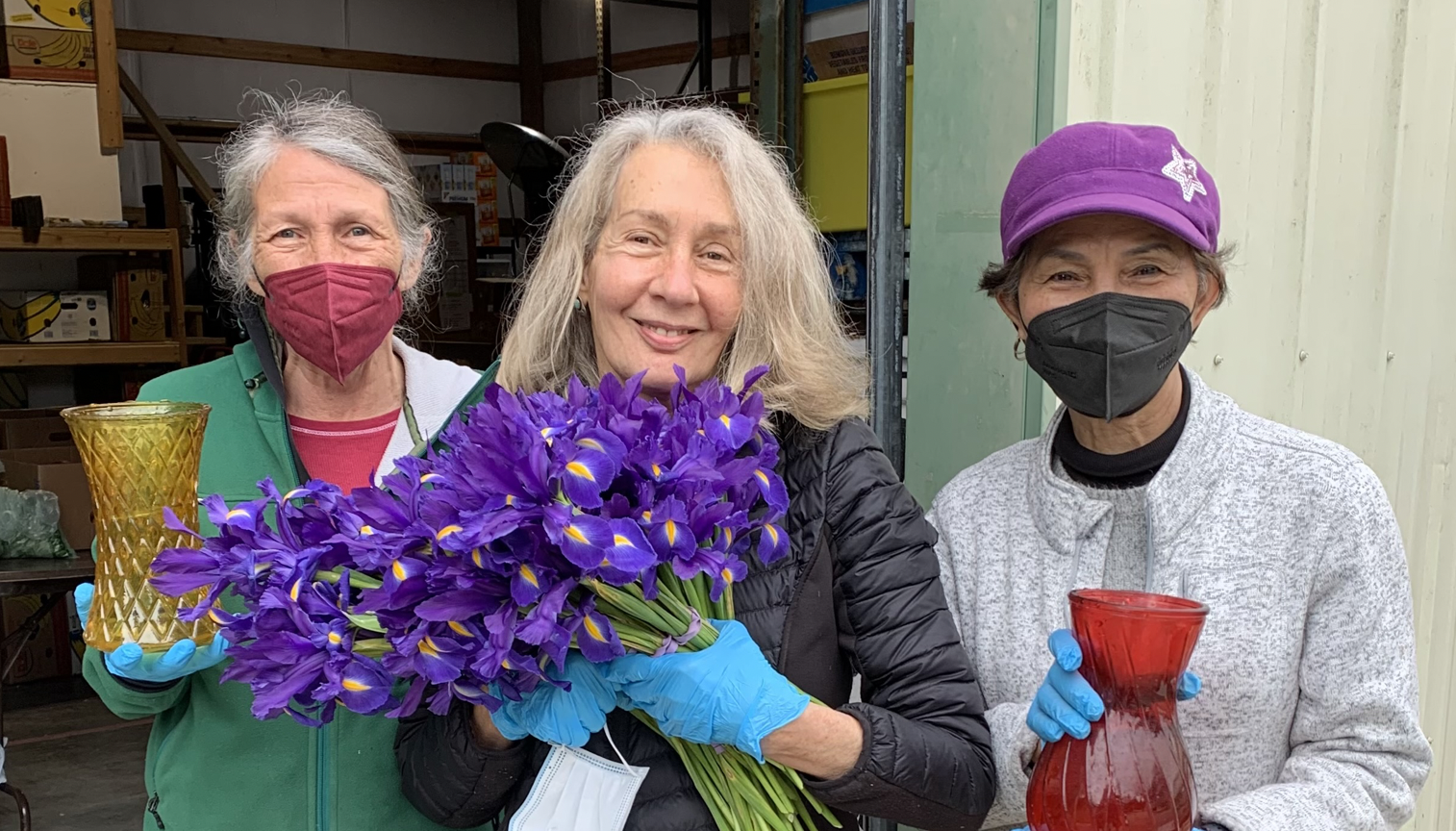 This spring Alice's Garden had a plethora or deep purple irises thanks to all that spring rain. Tri-Area Food Bank volunteers Linda, Lynn, and Carole had never seen irises in that shade of purple and everyone loved them.