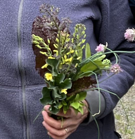 Tucked into the "nose gays" were sprigs of Purple Sprouting Broccoli which was still producing over at the Boat School garden. PBS isn't a perennial its planted in the prior fall, but in the spring it's a good harvest party starter with very sweet stems.