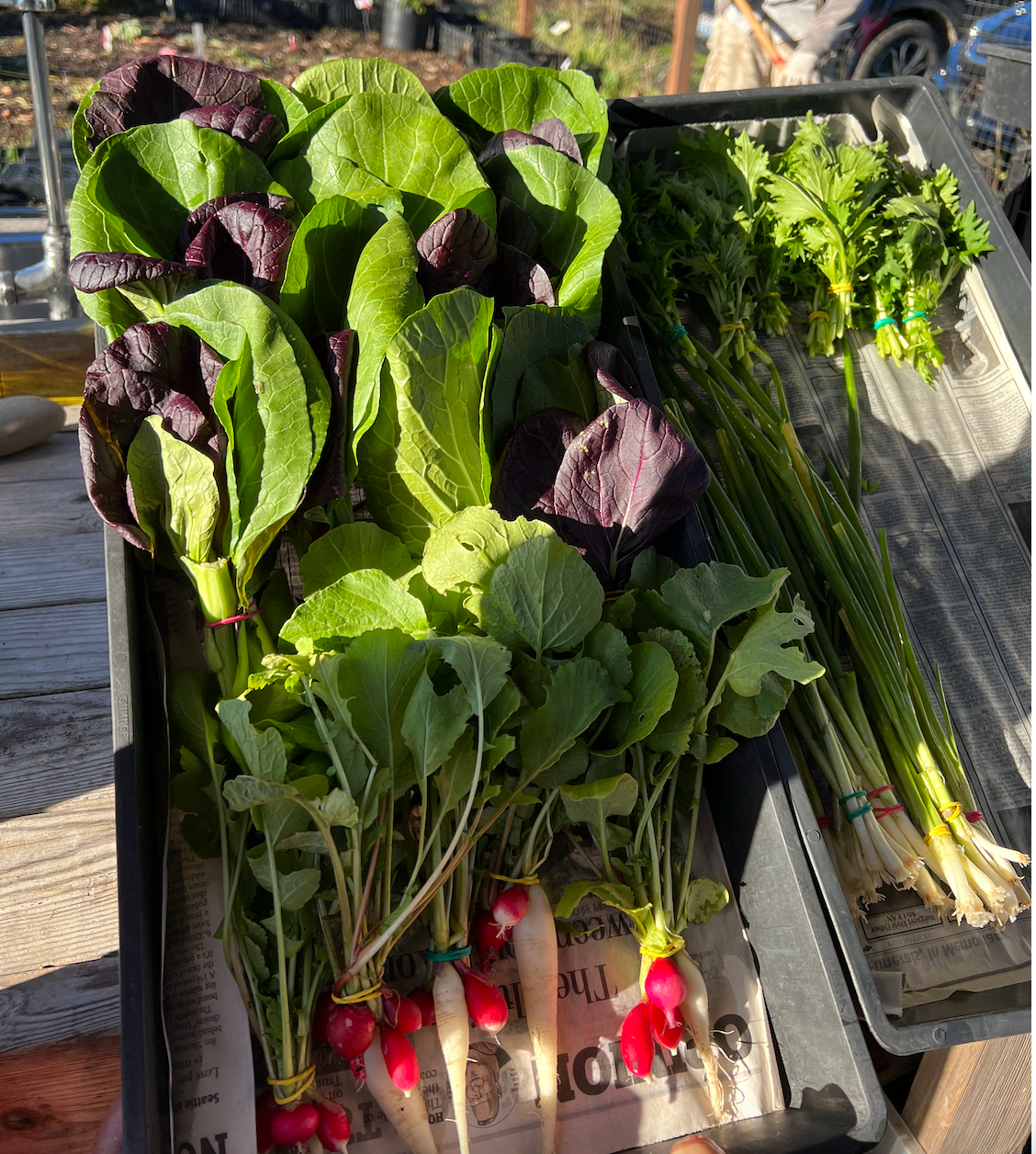 Above: Mary Beth Haralovich bunches up green onions to take to the PT Food Bank.