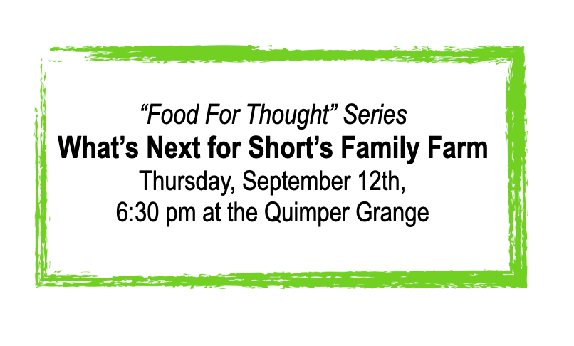 Food For Thought, a free monthly series offered by the Quimper Grange #720, will examine "all things food" in our area. Granges (derived from “grain” or “granja” [farm]) were grassroots organizations that sprung up across the United States in the 1860s to build strength and community among rural farmers. For over 100 years, the Quimper Grange has supported the Jefferson County community through public programming, concerts, dance, rental space, and a 7,000 SF all-volunteer garden which annually donates an average of 2,500 pounds to area Food Banks and meal-providing entities around our County.