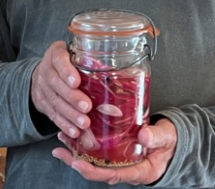 If you haven't pickled onions yet, now is the time to start. They are wonderful on salads, sandwiches, or topping off appetizers. Mark is holding the jar of onion goodness with the how-to recipe below.