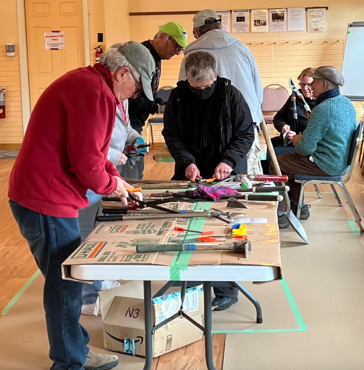 Five FBGgardens turned out for the spring Tool Maintenance Clinic. We all learned a lot about which sharpeners work the best on which tool, the benefits of a good brushing to get the large surface rust off, and howa touch of oil or WD-40 puts a spring in the springs and a slippery surface back on the shovels.