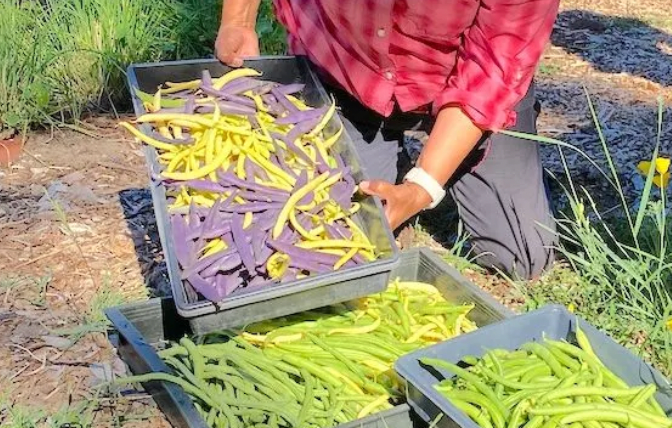 Top Left: LeeAnn McMillen with some of the beautifully colored bush beans she planted at Swan (there may be a few poles in there as well)