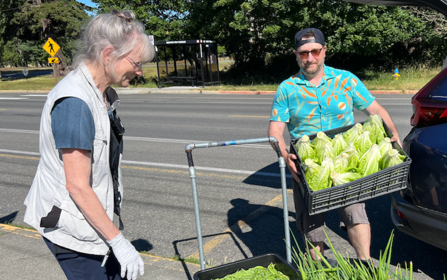 This Saturday, Salish Coast Garden Farmer Neil Howe and volunteer Bonnie Obremski harvested 50 pounds of lettuce, 40 pounds of peas, and 15 pounds of bunching onions for a total of 105 pounds.