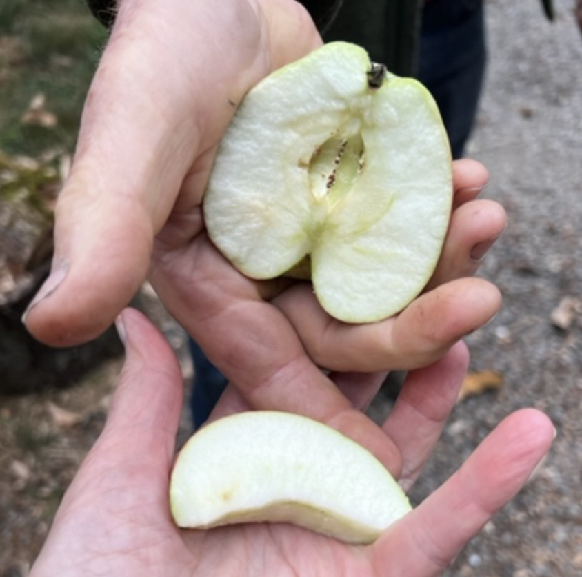 Apples and Asian Pears: Should taste sweet/tart and juicy, not sour and no "chalky" texture. The fruit should come off easily with a lift and twist. Seed should be brown to black. If seeds are white, check again in two weeks, if staring to turn brown, check again in a week. Falling fruit does not mean it is ripe, but if too much is falling it's really nice looking fruit, we can pick and store them for a week or two to ripen up. The will ripen off the tree, but we have very limited storage, so prefer to keep them on the tree until picking when possible. Bugs and Blemishes: Unless we are picking for cider or applesauce, these need to be attractive enough that someone will choose it out of a box to eat it. Look for bug damage, some trees are very buggy. Look for brown flecks around the blossom end or very small holes in the skin. Cut a few open to check.